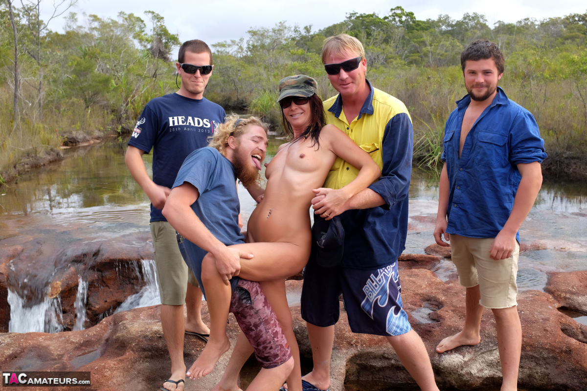 Фигуристая шлюха заигрывает с тремя парнями на отдыхе - секс фото