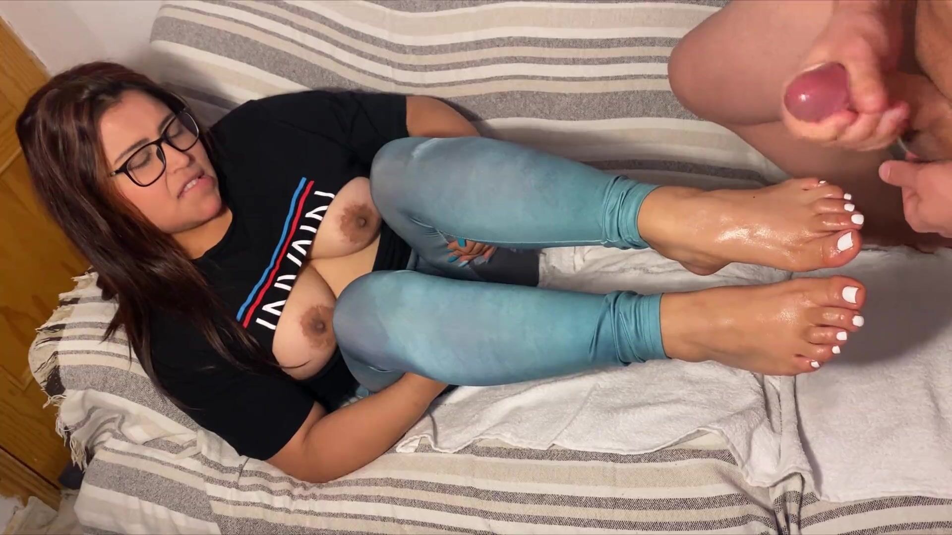 Горячая мачеха с оголенными ступнями делает парню футджоб и работает своим ротиком. Это новая практика для пасынка и мачехи что бы её молодой кабелек наконец кончил на её ножки.